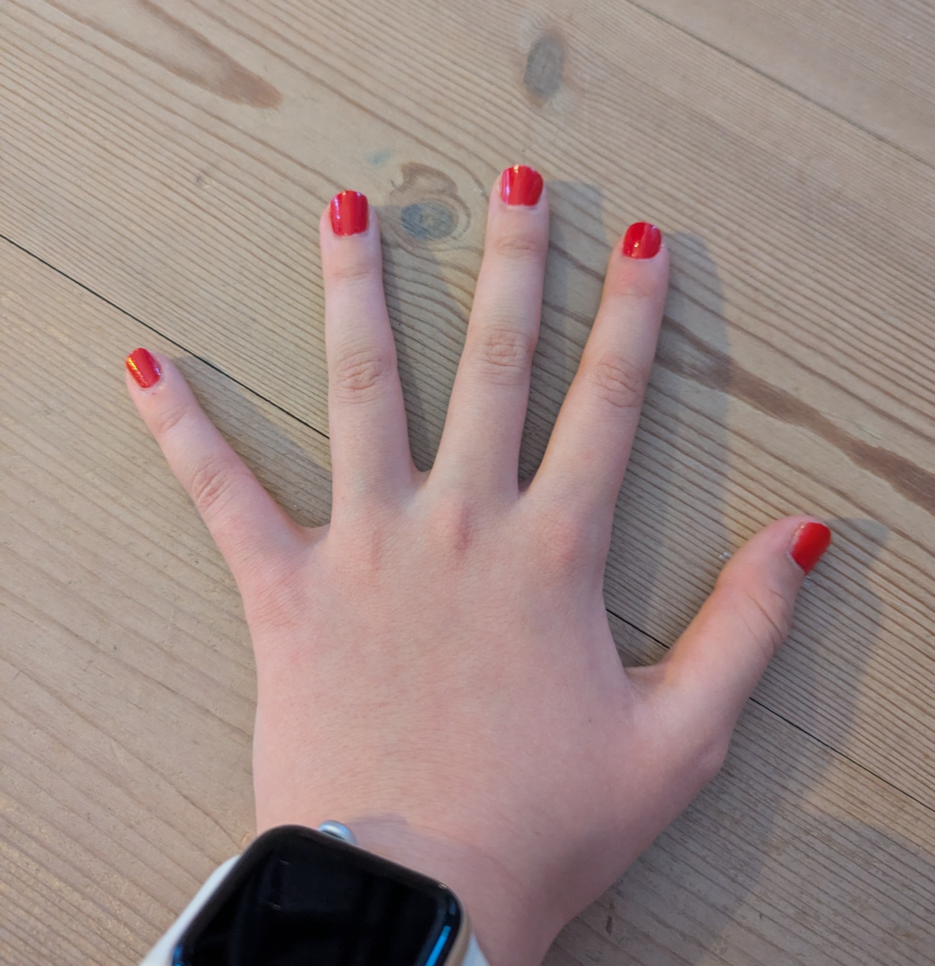 De her negle har jeg selv lavet.Først har jeg puttet base coat på også puttede jeg selve den røde neglelak på også puttede jeg top coat på.Jeg synes at det er en rigtig flot farve.