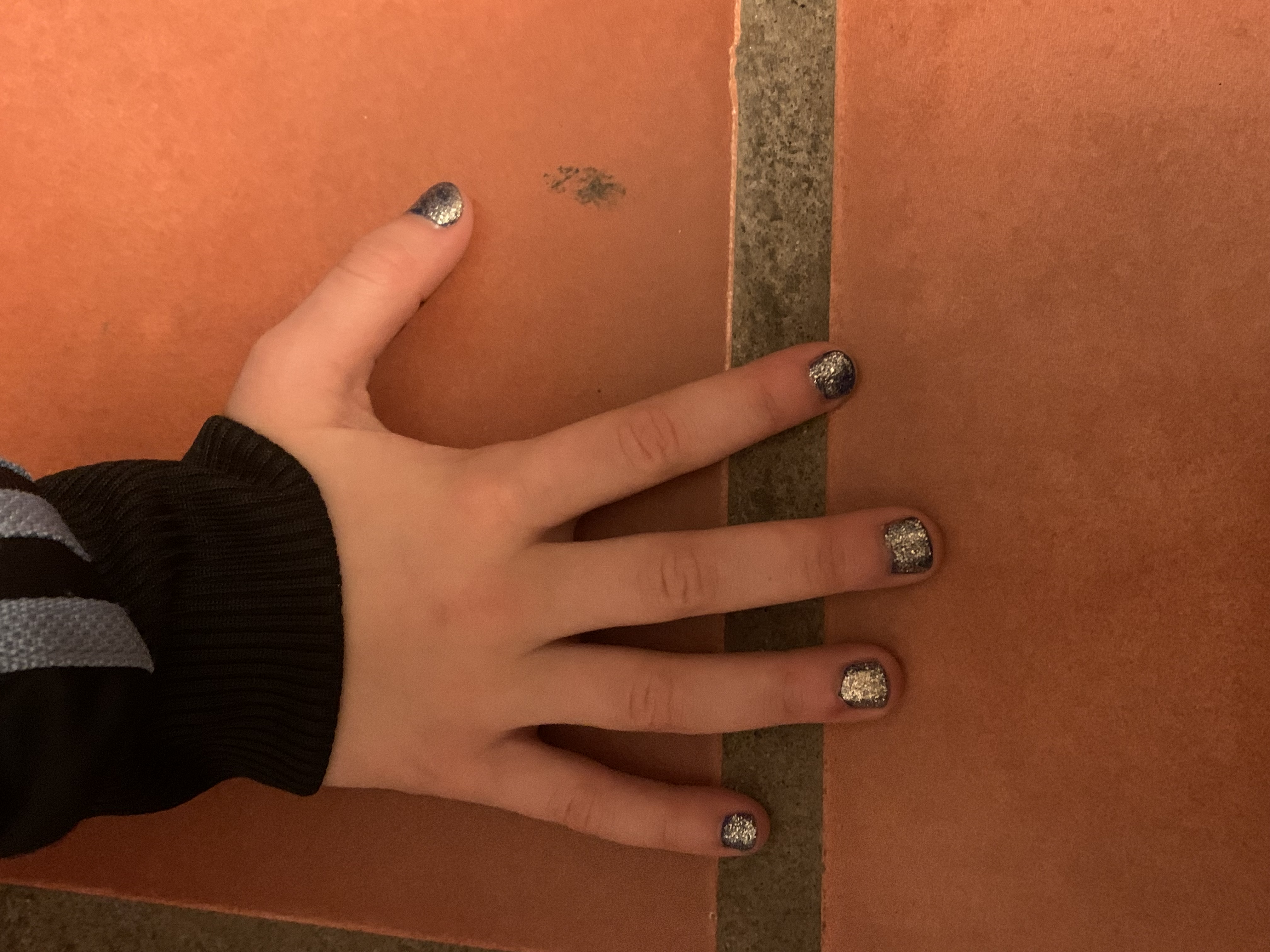 De her negle har jeg lavet på min lillesøster (Emma) og hun synes at de var seje. Det synes jeg også.Den var Så’n rigtig nice til fester synes jeg. Så’n jeg har lavet dem var at jeg først puttede base coat på, også puttede jeg den blå neglelak på, også puttede jeg guld glitteret på, også puttede jeg top coat på til sidst.